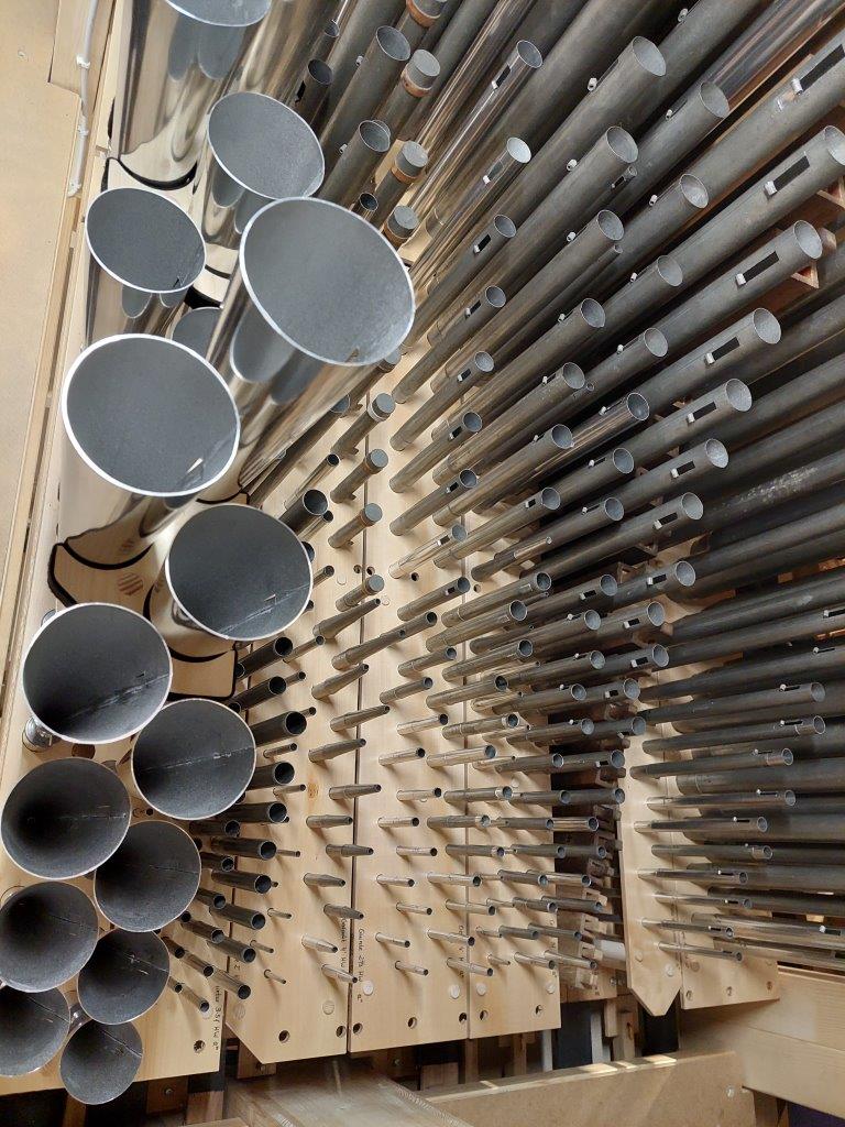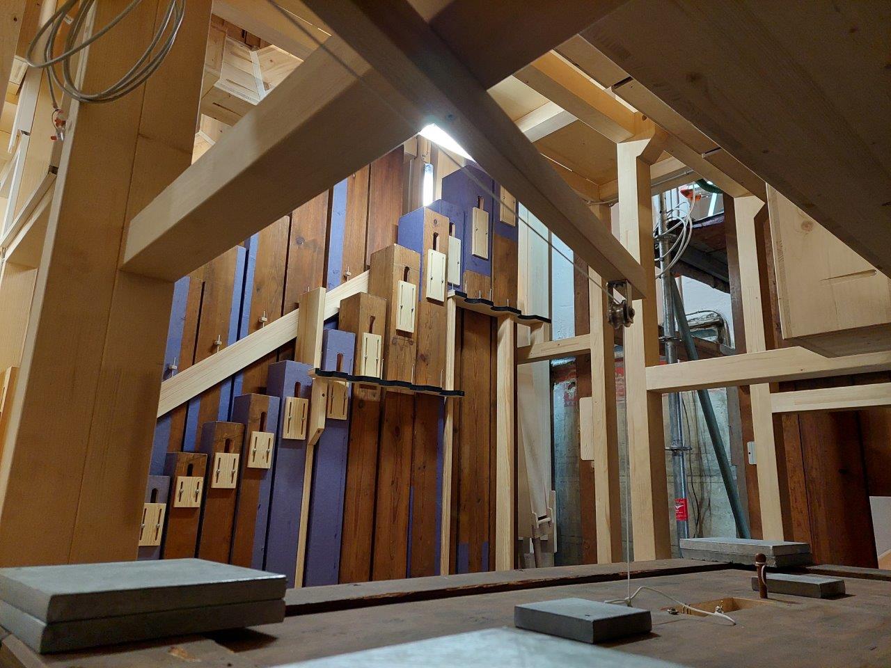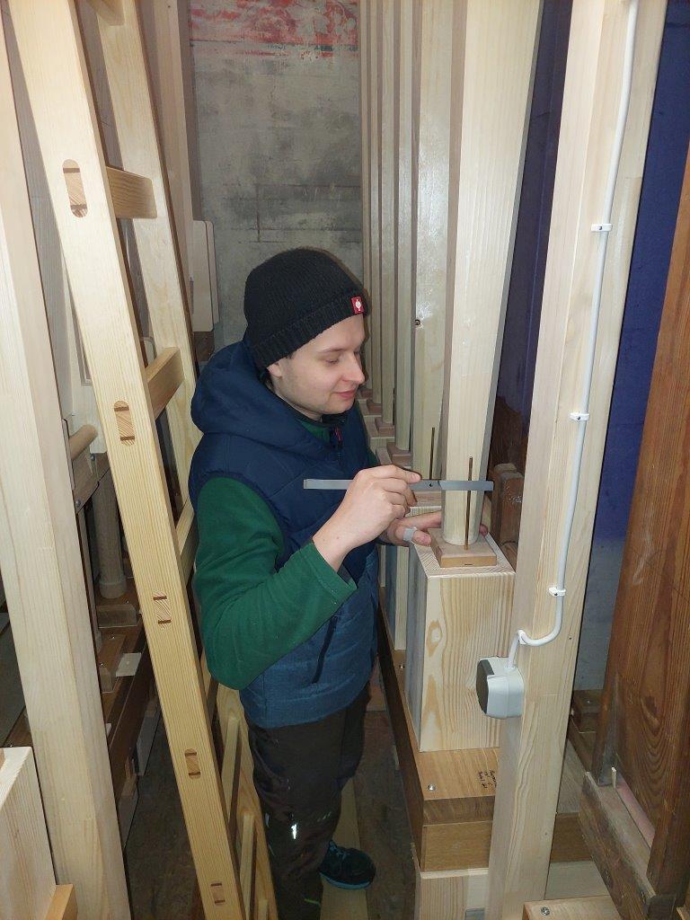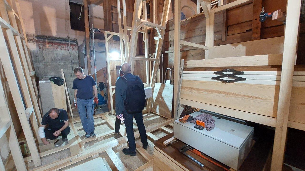 (Foto links: Einbauarbeiten, Foto rechts: reparierte alte und neue Holzpfeifen)