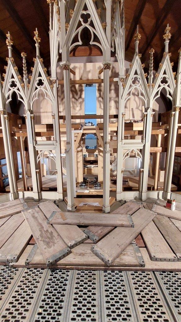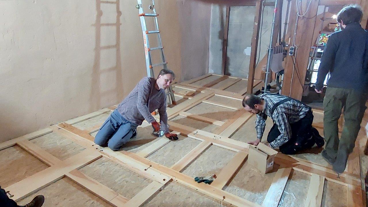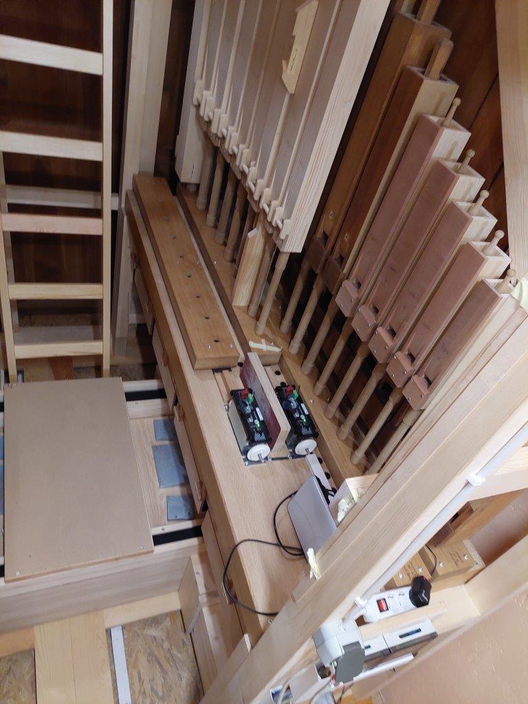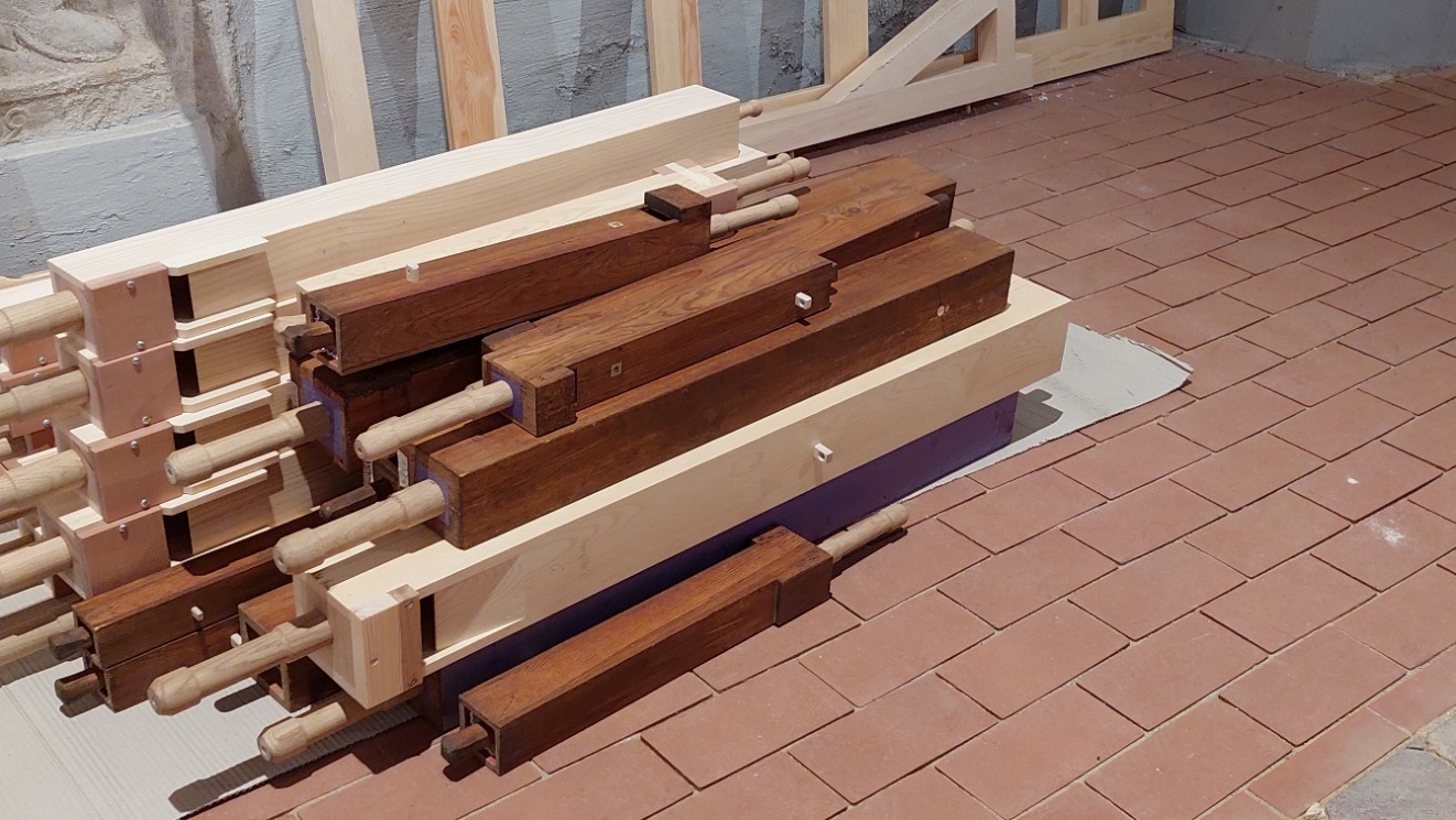 (Foto links: Einbauarbeiten, Foto rechts: reparierte alte und neue Holzpfeifen)