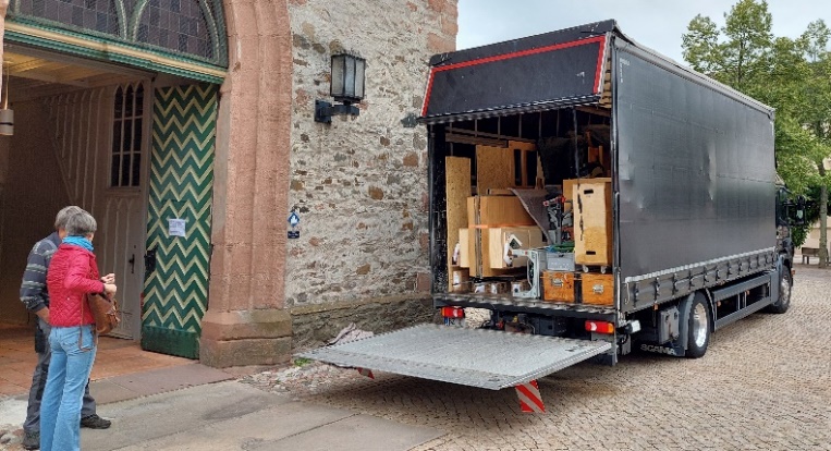 (Foto links: LKW-Entladung, Foto rechts: abgelegte Windkanäle und Balg,)